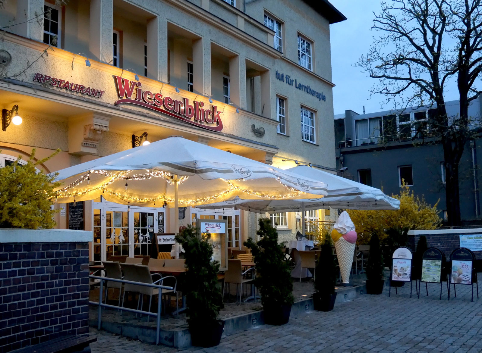 | Restaurant „Wiesenblick“ | Waldowstr. 1, 13053 Berlin, in der „Alten Feuerwache“ [Foto, Geschichte, Flyer, Kartenauszug] |