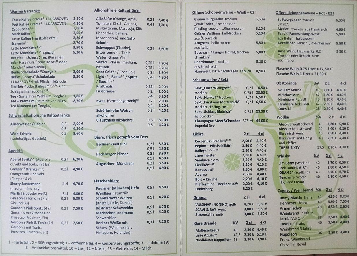 | (weitere) Getränke | am Tresen gegen Bares (offizielle Getränkekarte) |